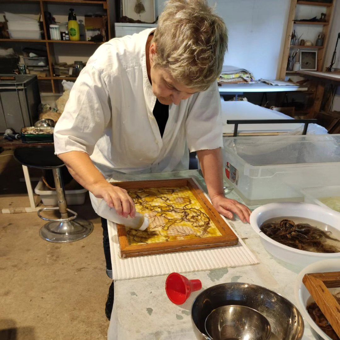 - Initiation à la technique de fabrication du papier par assemblage : Pâtes diluées versées sur le tamis ou dépose de « traits » de papier.