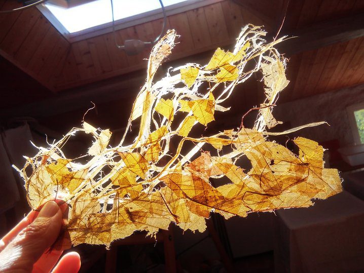 Le stage « Pâtes à papier et dentelles végétales » propose la découverte des fibres végétales (iris, mûrier, folle avoine, paille de blé ou prêle, micocoulier, peuplier, lierre…) extraites artisanalement à partir de plantes cueillies dans la région. Il permet de s’initier à une technique ancestrale de fabrication du papier, à travers la création de papier végétal et d’expérimenter la fabrication du papier comme un mode d’expression à part entière.